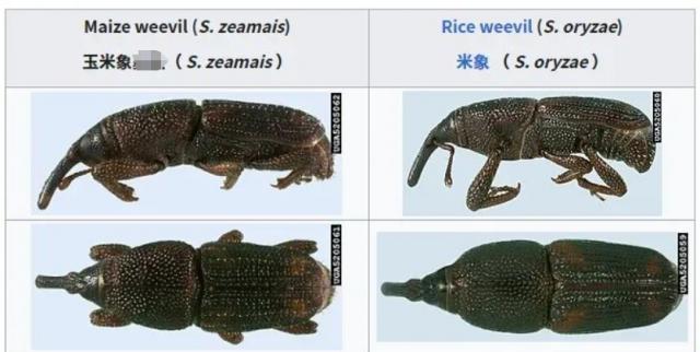 大米中象鼻虫有两种:米象(Sitophilus oryzae)和玉米象( Sitophilus zeamais)。