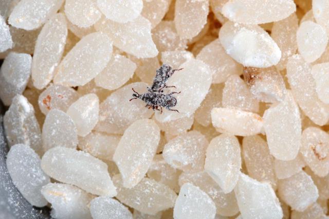 米象在产卵时会啃开大米粒,将卵产在米粒内部,并分泌黏状物封住洞口,所以我们肉眼很难看到。到了合适温度和湿度的时候,这些虫卵就会在米粒内部孵化发育。因此,大部分时候,粮食中的米象并非来自外部,而是内部孵化。