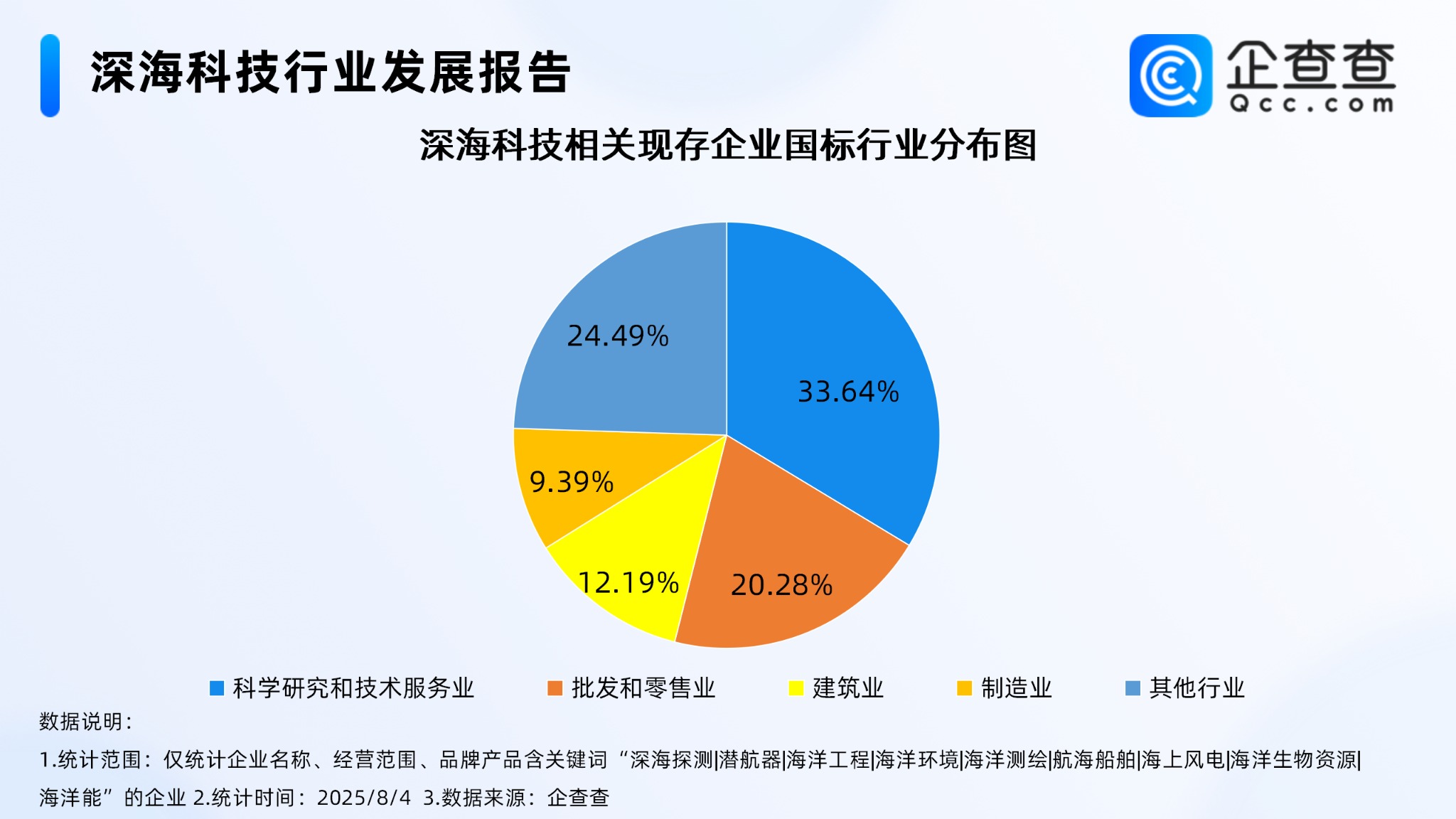 企查查数据显示,从国标行业分布来看,国内深海科技相关现存企业中,超3成相关企业归属于科学研究和技术服务业,占比达33.64%,其次为批发和零售业,占比达20.28%。