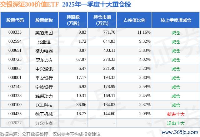 从基金规模来看,交银深证300价值ETF基金2025年一季度公布的基金规模为0.69亿元,较上一期规模7156.17万元变化了-239.82万元,环比变化了-3.35%。该基金最新一期资产配置为:股票占净值比97.36%,债券占净值比0.09%,现金占净值比2.7%。从基金持仓来看,该基金当季前十大股票仓位达45.83%,第一大重仓股为美的集团(000333),持仓占比为11.16%。