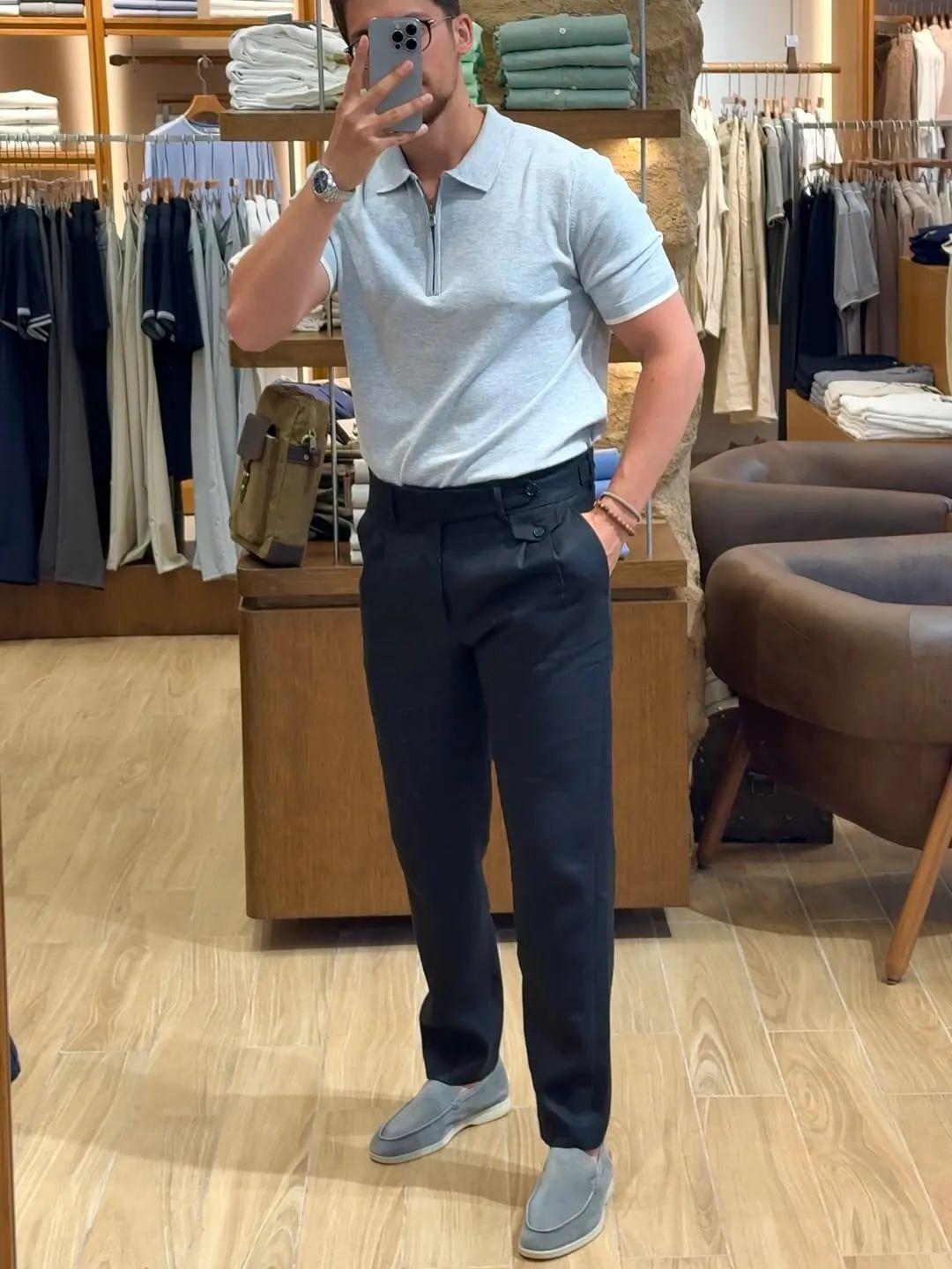 look2:灰色polo衫+深蓝色西装裤+灰色乐福鞋