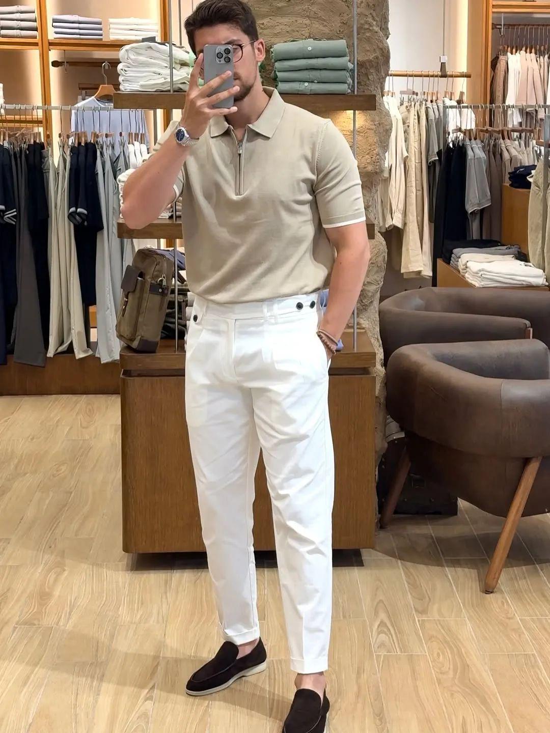搭配要点:卡其色的polo衫非常百搭,颜色比较贴近我们的肤色,因此也适合大部分男士来穿,搭配一条白色的西装裤,纯净的色调给人一种干净利落的感觉,黑色乐福鞋则增添的穿搭的层次感,整体简约大气,成熟帅气!