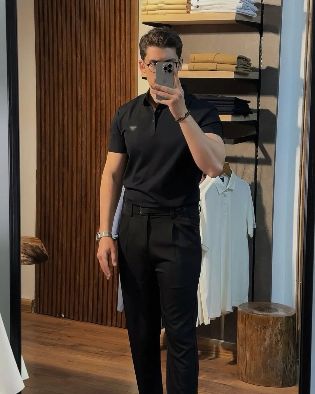 搭配要点: 黑色polo衫给人一种非常成熟稳重的气质胜亿配资,搭配黑色的西装裤,呈现出一种“一身黑”的造型,搭配一双黑色的皮鞋,能够让整体造型更加成熟酷帅,很适合商务场合穿搭。