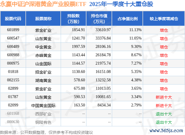 从基金规模来看,永赢中证沪深港黄金产业股票ETF基金2025年一季度公布的基金规模为30.21亿元,较上一期规模16.51亿元变化了13.7亿元,环比变化了82.96%。该基金最新一期资产配置为:股票占净值比99.56%,无债券类资产,现金占净值比0.78%。从基金持仓来看,该基金当季前十大股票仓位达66.93%,第一大重仓股为紫金矿业(601899),持仓占比为11.13%。
